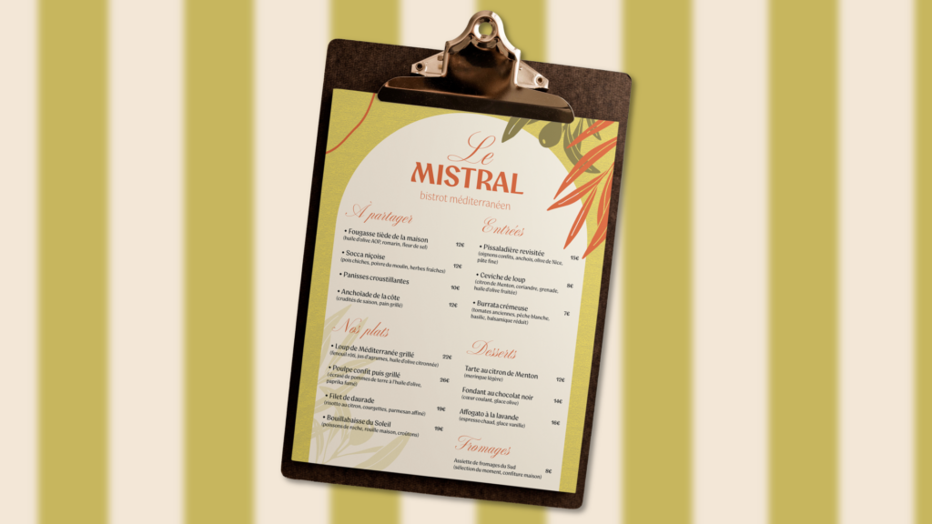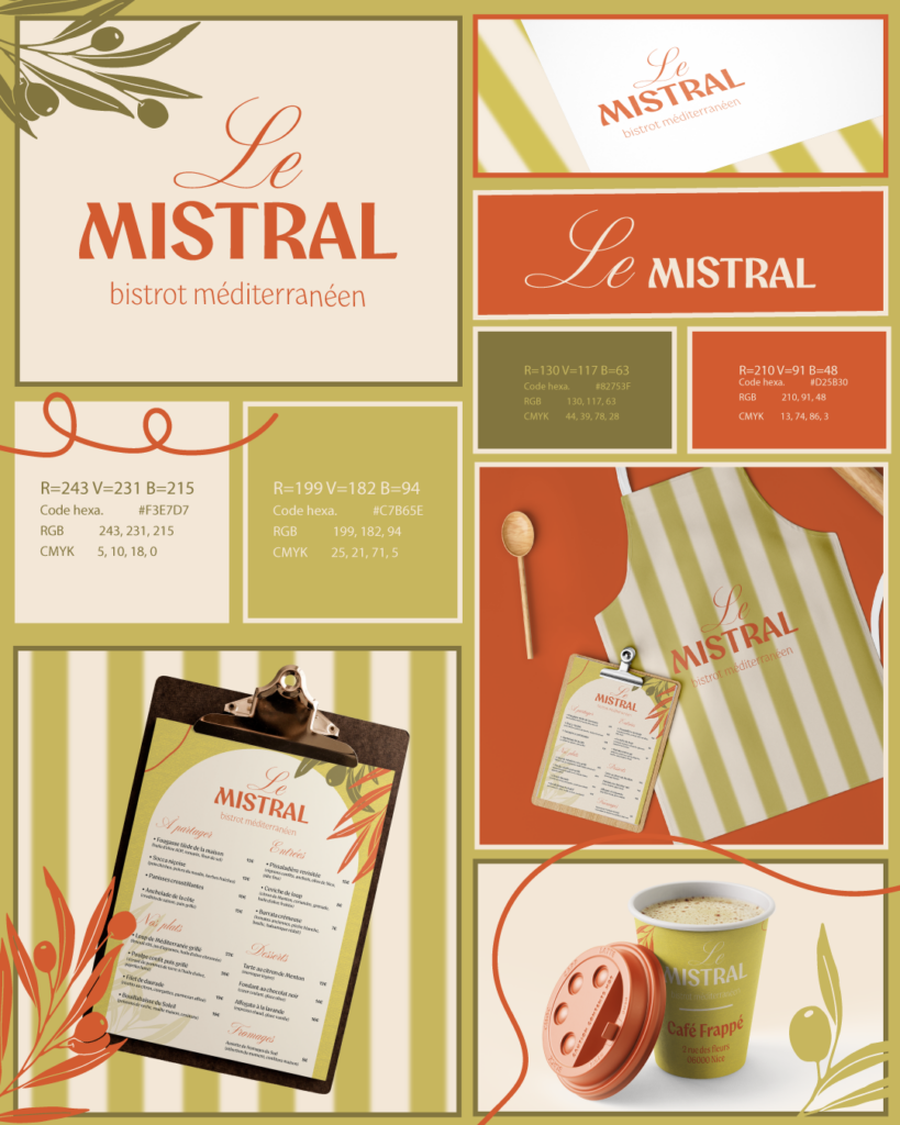 Il m’a confié la création de son identité visuelle, avec l’envie de transmettre une atmosphère chaleureuse et résolument inspirée du Sud. Le vert s’est naturellement imposé dans la palette, en clin d’œil aux olives qu’il affectionne tout particulièrement.